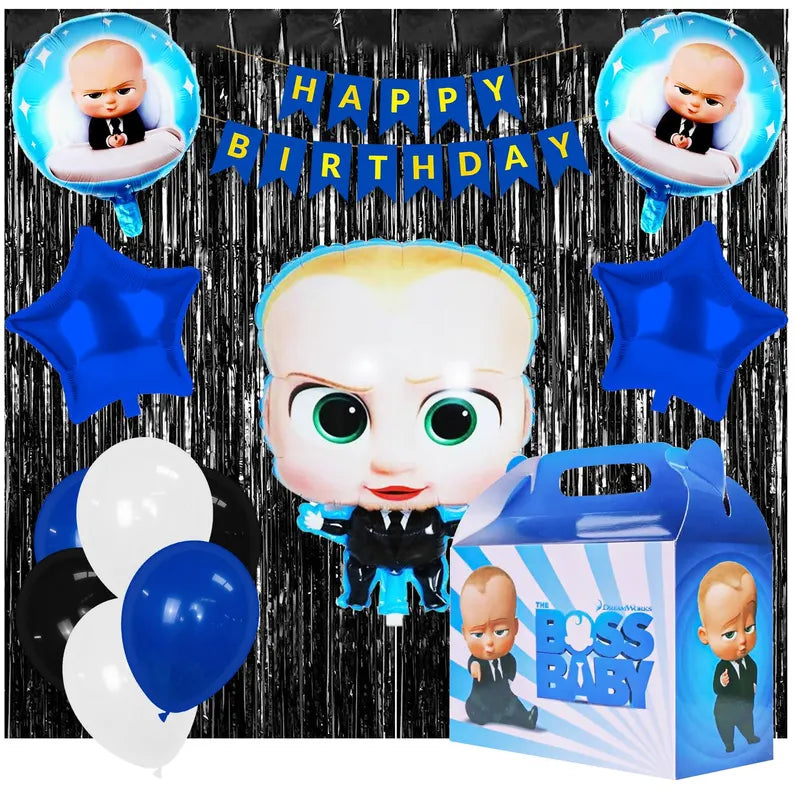 Baby Boss Birthday Decoration Kit – Foil Balloons, Banner, Goodie Boxes & Curtain | Boys Party Supplies