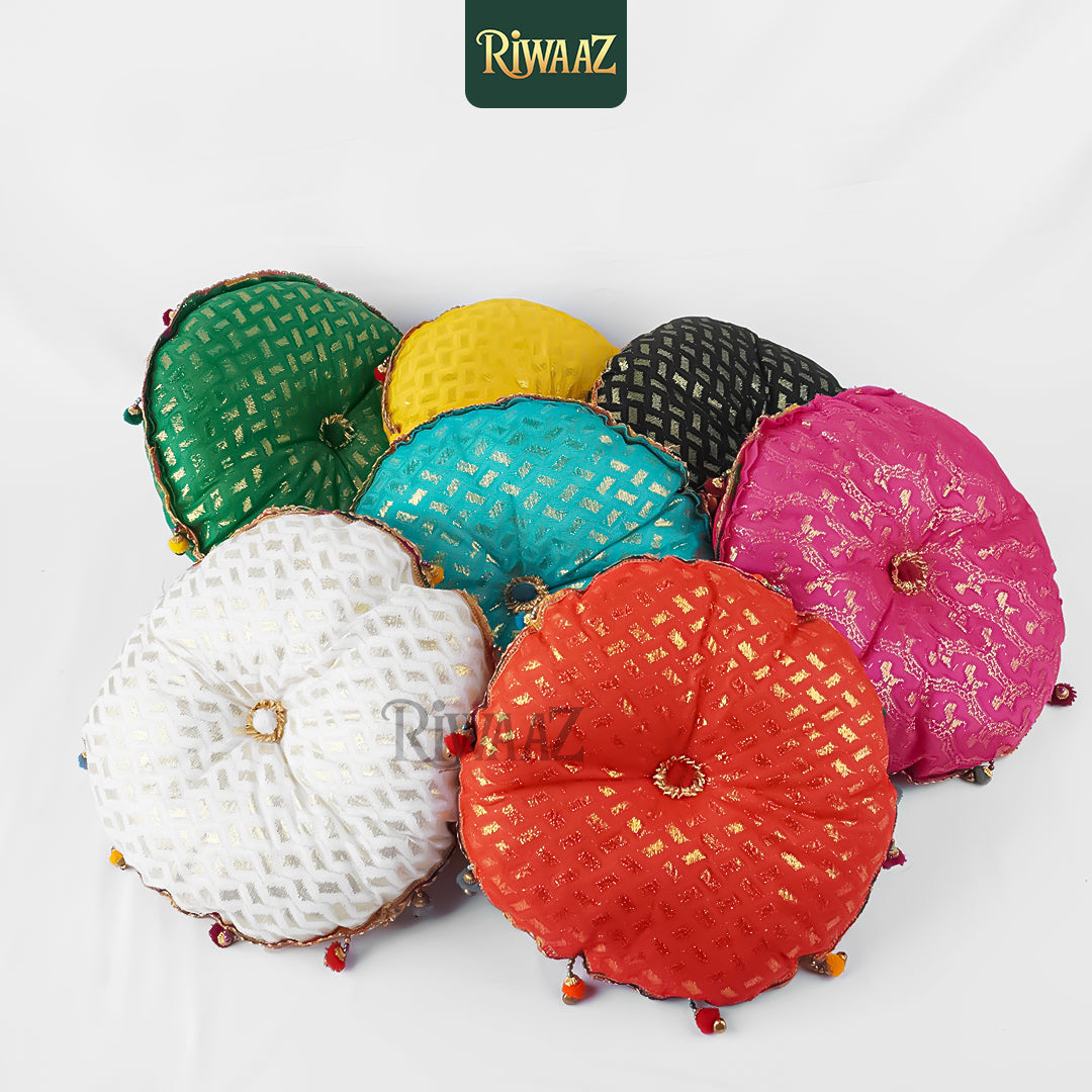 Round Jamawar Fabric Pillow, Cusion Perfect For Traditional Wedding Decor Including Mehndi, Nikkah, Maiyun, Vivah, and Cultural Celebrate